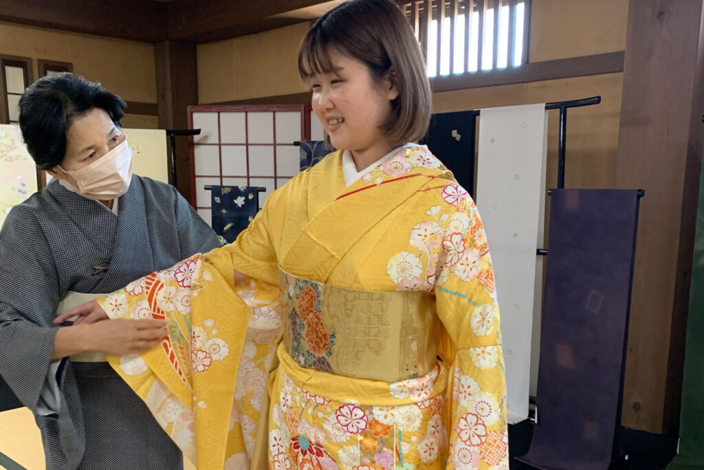 着物は仕立て上がるとより一層印象が鮮明になりますので出来上がりをお客様と確認させて頂いております。また、このタイミングでサイズに不都合がないかなども合わせてご確認頂く事で、撮影や当日も安心して迎えて頂けます。